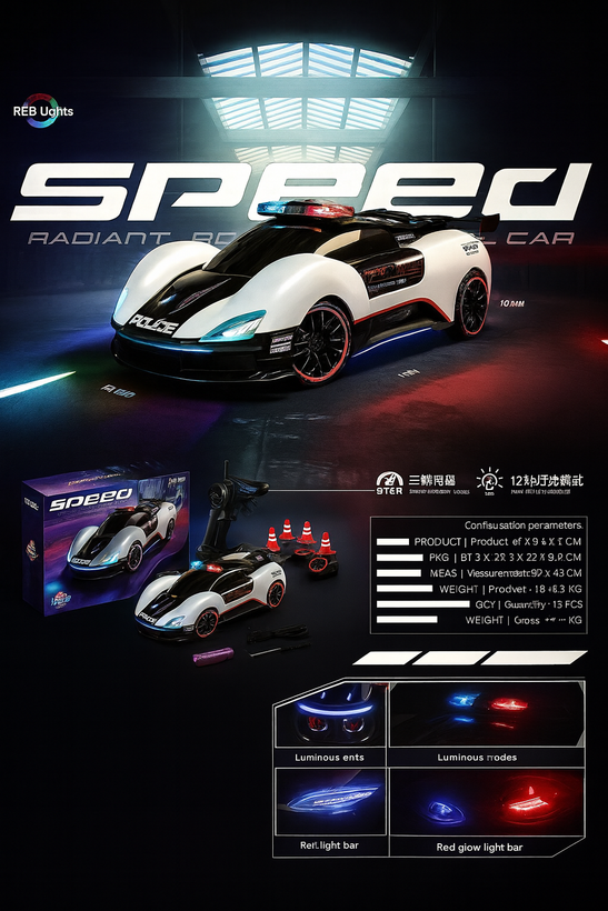 ماشین کنترلی پلیس اسپرت دریفتی شارژی با چراغ RGB و لاستیک قابل تعویض
